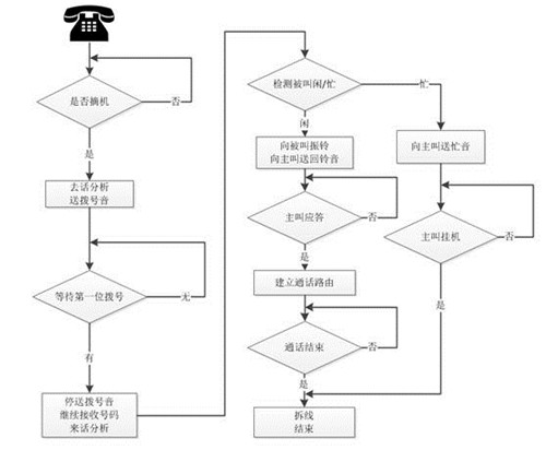 (2)巡線:指某個電話振鈴但無人應答,在同一個巡線組內隨機撥打到該巡線組的其他某個電話,使之振鈴并通話。