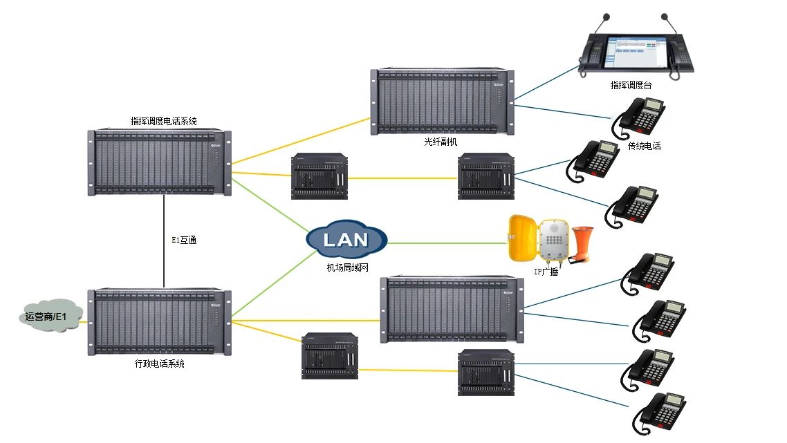 1、機場指揮調(diào)度電話系統(tǒng)在主機房配置利達信JSY9000電話調(diào)度機,配置雙系統(tǒng)雙電源熱備,配置800分機與128路并發(fā)錄音系統(tǒng),配置2T硬盤存儲錄音。在多個遠(yuǎn)端機房部署光端機,通過光纖連接申甌電話調(diào)度機,下行部署網(wǎng)線或者電話線連接到語音點位,部署電話終端。