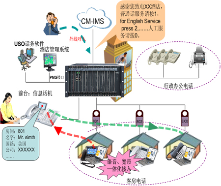 申甌IMS融合通信系統(tǒng)提供開放、標(biāo)準(zhǔn)的PMS酒店管理接口,既可與申甌酒店管理軟件配合使用,也能實(shí)現(xiàn)與原有酒店管理軟件無縫隙融合,不僅保護(hù)酒店原有的投資,又為酒店提供提供了豐富實(shí)用、可管理的酒店應(yīng)用,如入住\退房登記、客房免打擾、叫醒服務(wù)等;