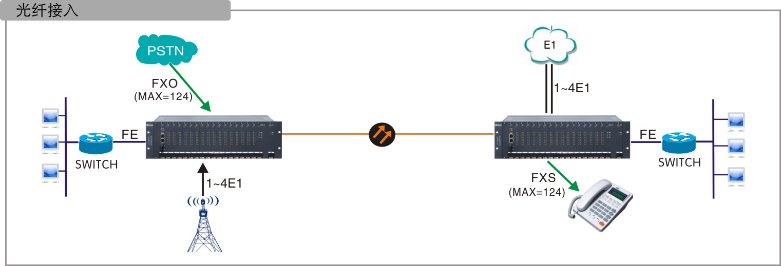 采用光纖線路傳輸,設(shè)備最大配置124路FXO或FXS、4E1、1~2路物理隔離以太網(wǎng)業(yè)務(wù)。
