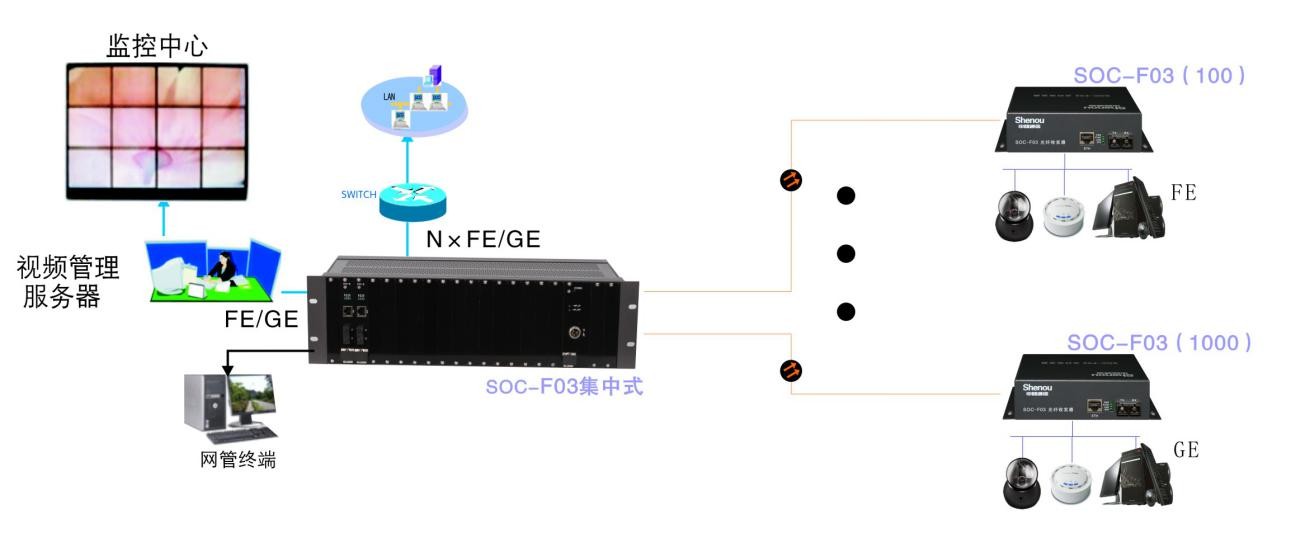 該方案局端放置一臺SOC-F03集中式業務,下放以太網(FE/GE)業務口,與各個遠端之間通過光纖直連,遠端放置SOC-F03桌面式設備,下放以太網業務口。可統一納入SOC-NM2005網管平臺,提供完善的網管功能