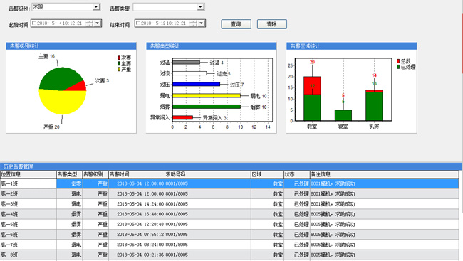 當下各類傳感器已經進入我們的生活,很多環境的檢測告警都已通過傳感器實現,申甌校園智控“云”系統完美的融合了各類傳感器,如煙感、紅外、過壓、過流、過溫、漏電等等。可部署在學校的教學樓、宿舍樓、機房等。一旦觸發告警,我們的告警平臺(下圖所示)會“自動彈窗告警”,告警彈出窗口會顯示哪個時間、什么地點、發生了什么類型的告警,通過系統的多維度圖表分析,我們可分析告警的占比情況,如告警嚴重性等級、告警類型分類、告警地點。并且報警會觸發我們預先設置好的報警終端話機,接聽后會自動重復播報發生報警的地址位置。通過此系統,我們能將預防做到前面、將危險控制在萌芽階段。